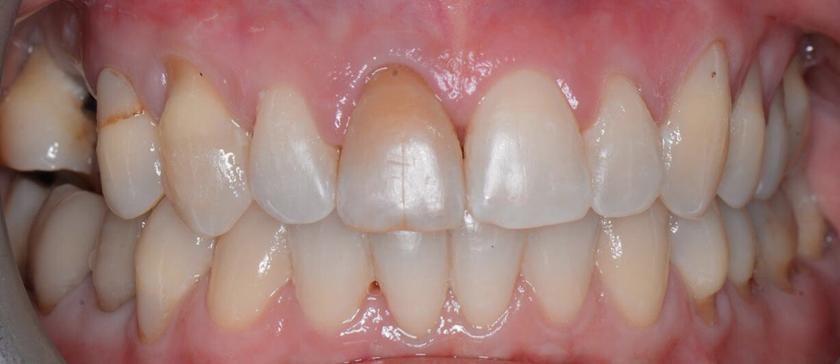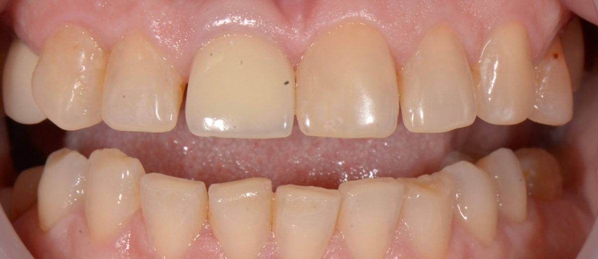 Pacjentka zdecydowała się na leczenie ortodontyczne z wykorzystaniem aparatu stałego w górnym łuku oraz zabieg implantacji zęba, z późniejszą odbudową protetyczną w postaci pełnoceramicznych koron oraz korony na implancie.